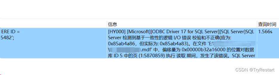 SQL Server 检测到基于一致性的逻辑 I/O 错误 校验和不正确(应为: 0x85ab4a86,但实际为: 0x85ab4a83)。在文件 ‘E:\BDAIData.mdf’ 中、偏移量为 0x00000b32a16000 的位置对数据库 ID 5 中的页 (1:5870859) 执行 读取 期间,发生了该错误。SQL Server 错误日志或系统事件日志中的其他消息可能提供了更详细信息。这是一个威胁数据库完整性的严重错误条件,必须立即纠正。请执行完整的数据库一致性检查(DBCC CHECKDB)。此错误可以由许多因素导致;有关详细信息,请参阅 SQL Server 联机丛书。完成时间: 2023-04-27T21:19:31.2286360+08:00