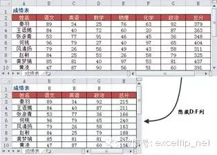 本例通过设置辅助行,设置CELL函数的第1参数为”width”计算单元格列宽,当单元格被隐藏时,列宽值为0。然后以列宽值为条件,使用SUMIF函数求出列宽大于0的对应成绩之和。